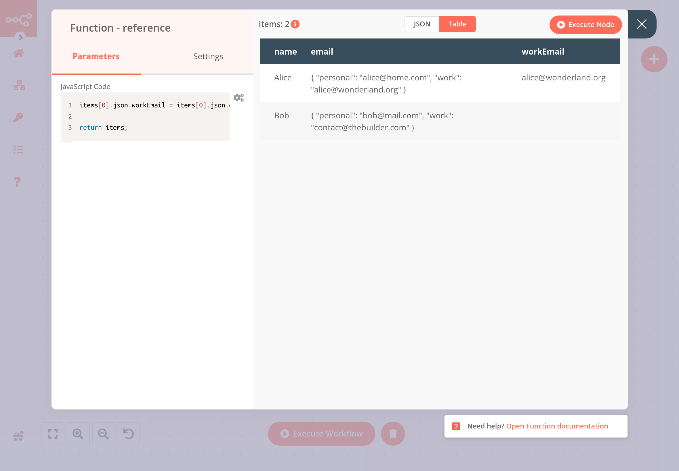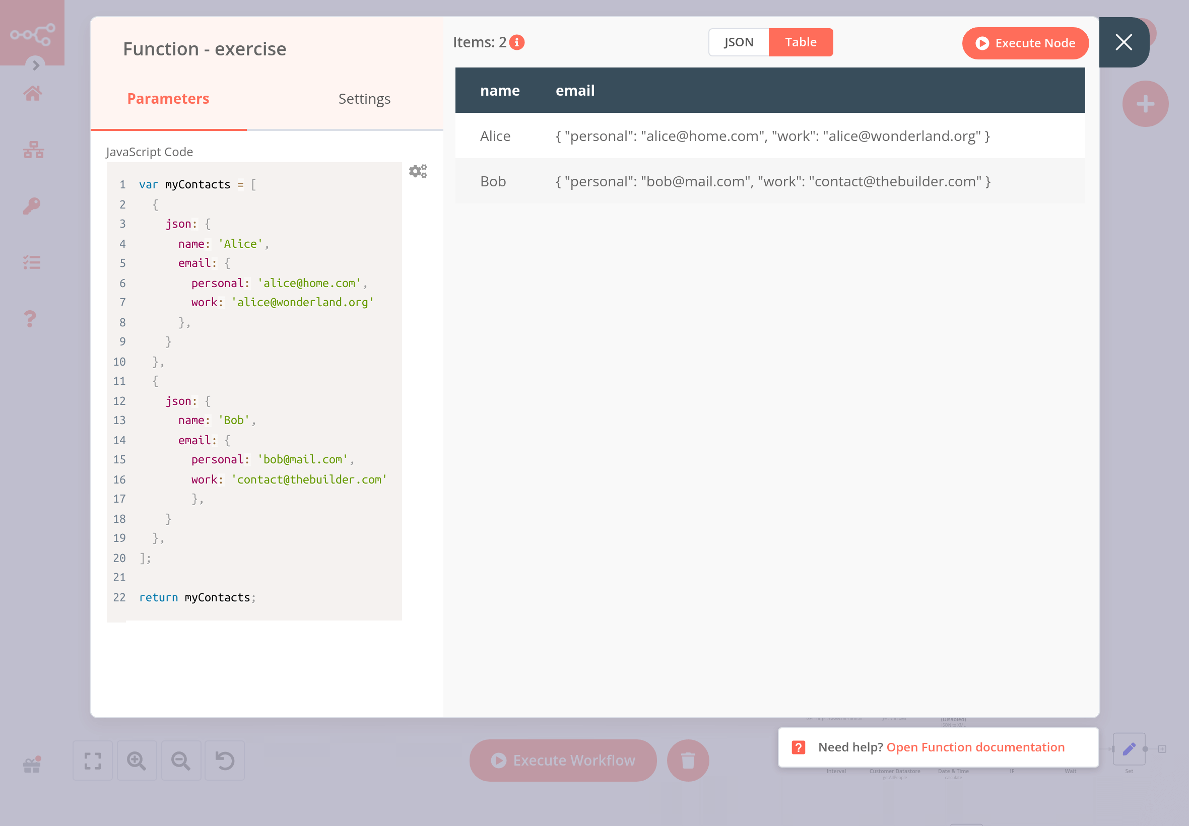 Let's build on the previous exercise, in which you used the Function node to create a data set of two contacts with their names and emails. Now, connect a second Function node to the first one. In the new node, write code to create a new column named workEmail that references the work email of the first contact.
