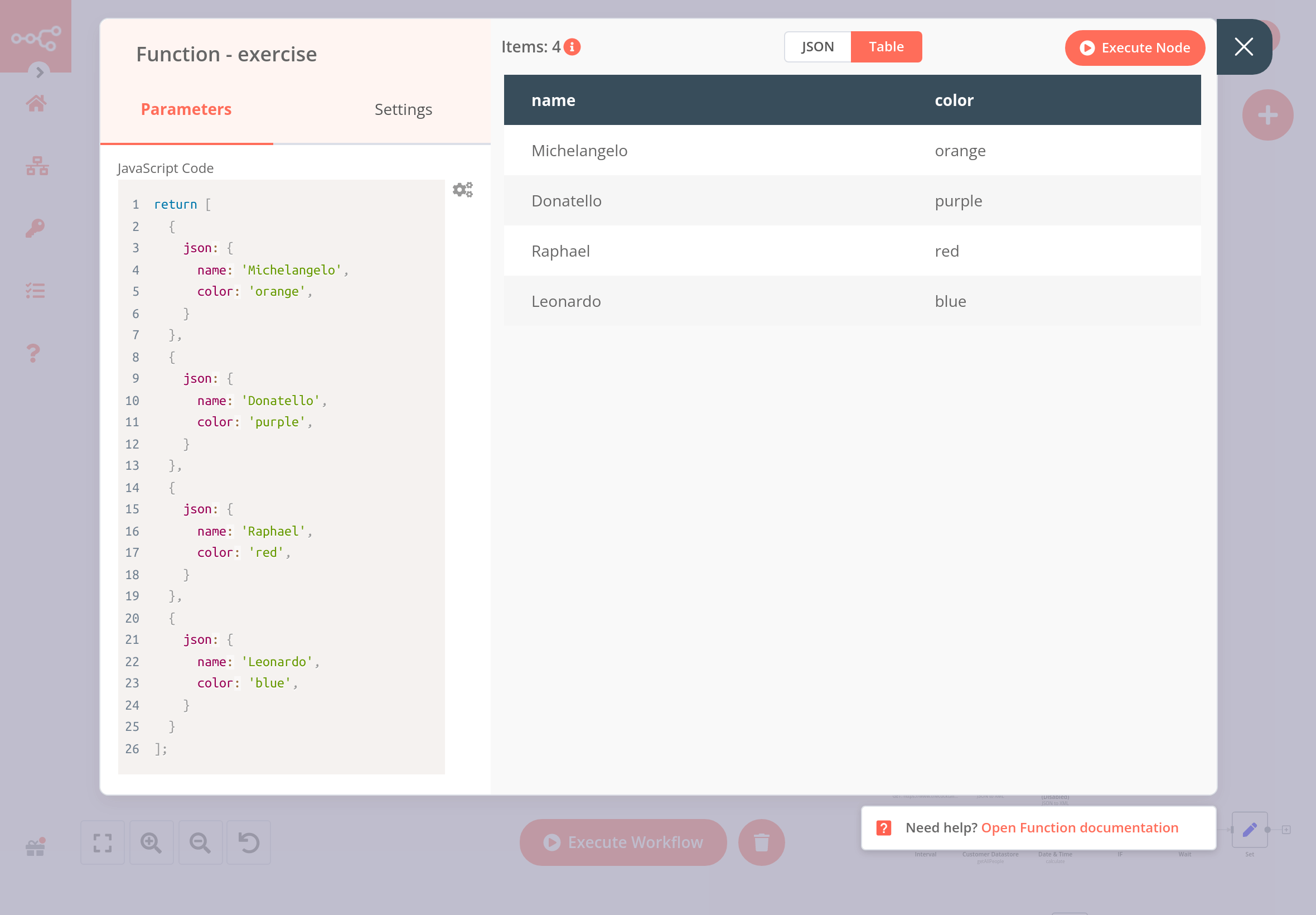 For example, the array of objects representing the Ninja turtles would look like this in the Function node:
