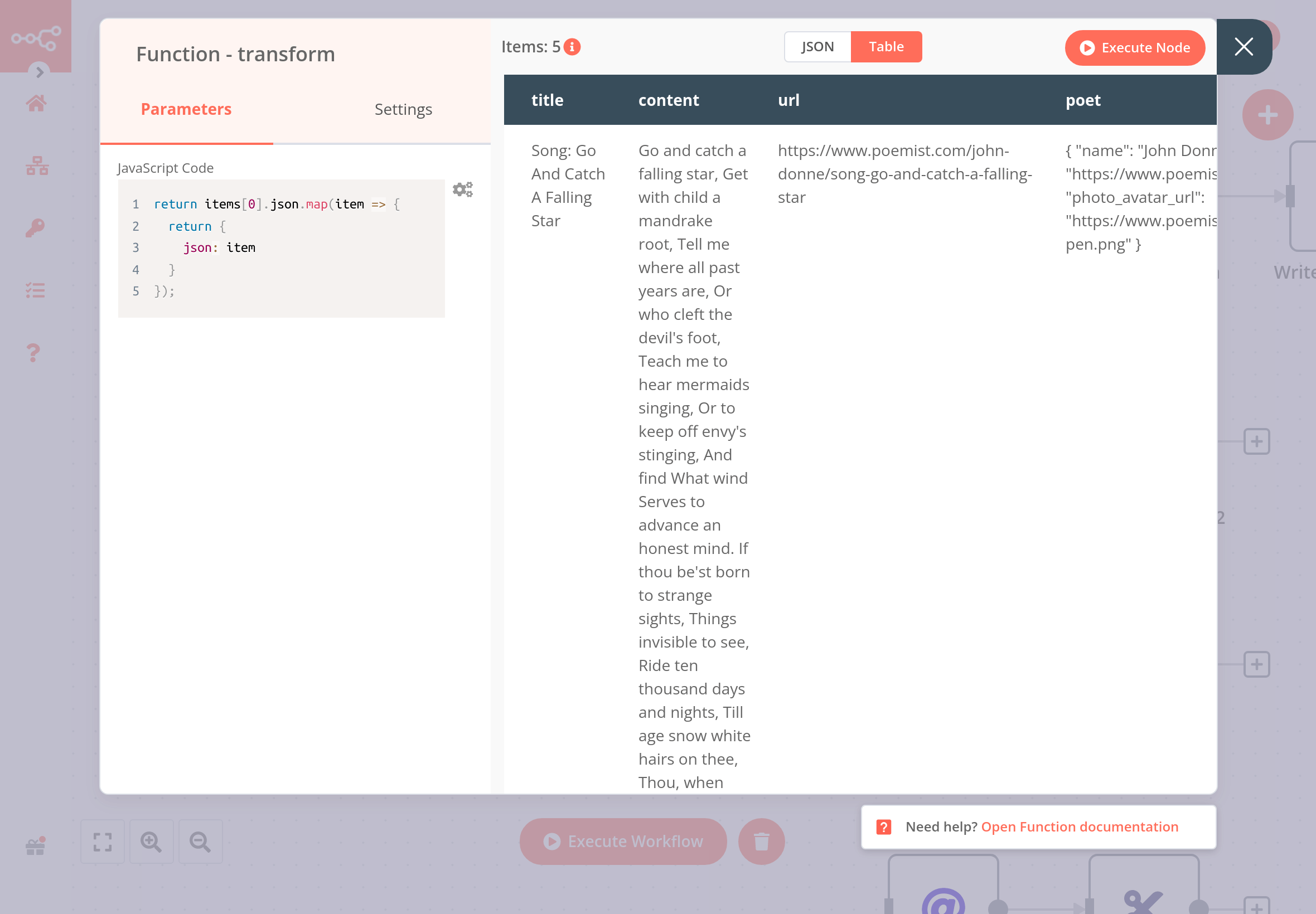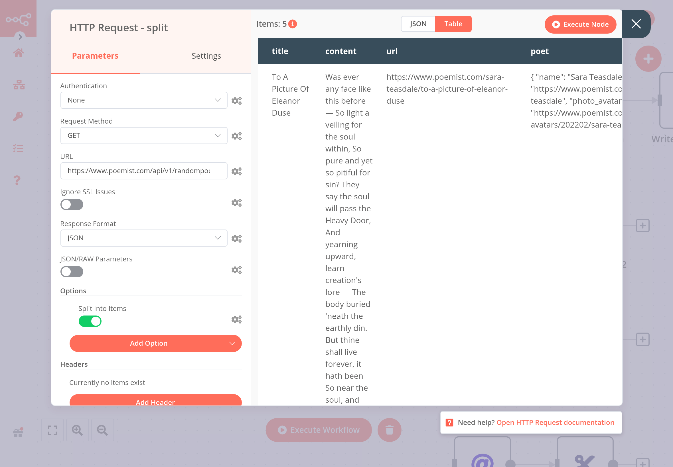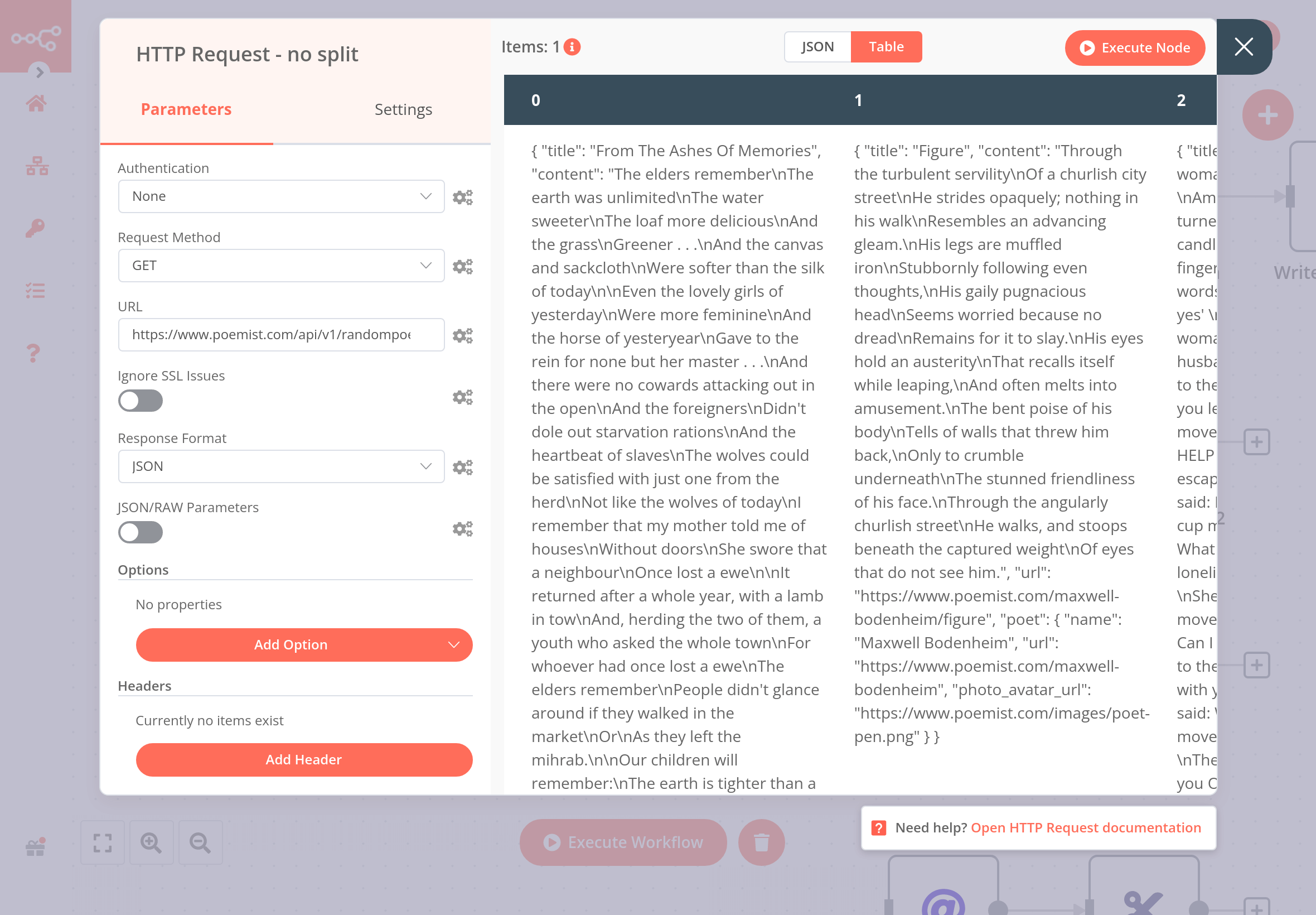 Use the HTTP Request node to make a GET request to the Poemist API https://www.poemist.com/api/v1/randompoems. Transform the incoming data with the Split Into Items option and with the Function node.