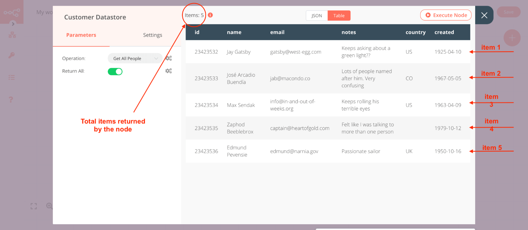 Now that you are familiar with the n8n data structure, you can use it to create your own data sets or simulate node outputs. To do this, use the Function node to write JavaScript code defining your array of objects with the following structure: